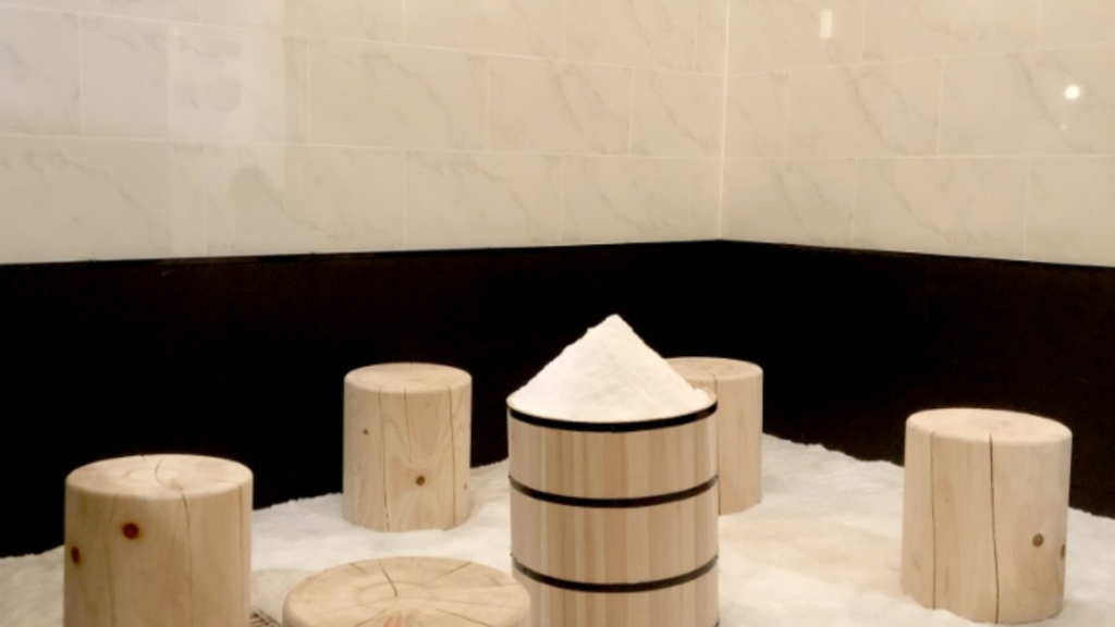 今まで経験した塩サウナの中で一番肌に合った塩サウナです!丸太椅子と中央に山盛りの塩が置いてあるシンプルな空間ですが、温度が80〜85℃と高めで、しっかり発汗できます。